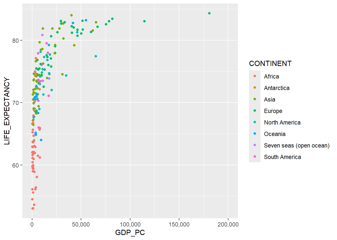 ggplot(aes(x = GDP_PC, y = LIFE_EXPECTANCY, color= CONTINENT)) +