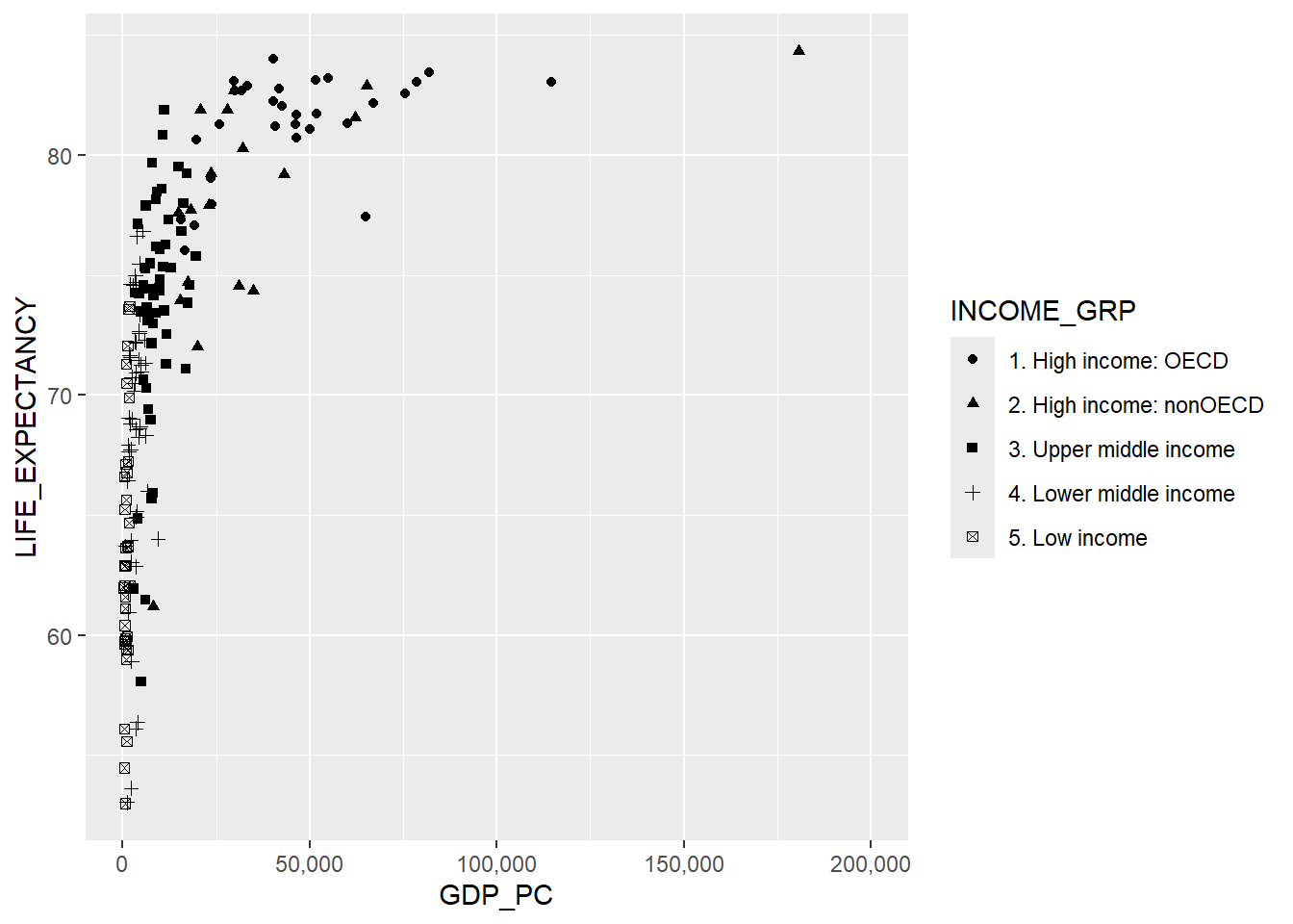 ggplot(aes(x = GDP_PC, y = LIFE_EXPECTANCY, shape= INCOME_GRP)) +