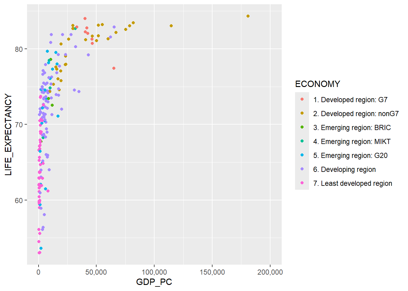 ggplot(aes(x = GDP_PC, y = LIFE_EXPECTANCY, color= ECONOMY)) +